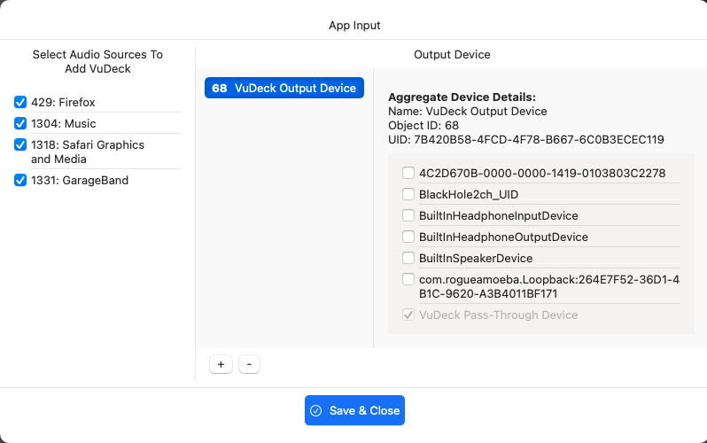 After clicking the Save & Close button, if there are no errors, VuDeck will be ready to process any audio passing through the selected virtual audio loop-back device.