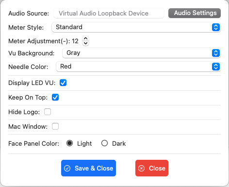 VU Background: The background of the Analog VU Meter can be set to Blue, Yellow, or Gray.