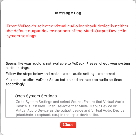 Whenever you make changes to your system’s audio settings, depending on VuDeck's current state, you may receive an error message if you run VuDeck after the system change, or a warning if VuDeck was still running at the time of the change. The nature of the error message can vary based on the device you’re using (e.g., third-party virtual audio loop-back device or VuDeck’s pass-through virtual audio device).